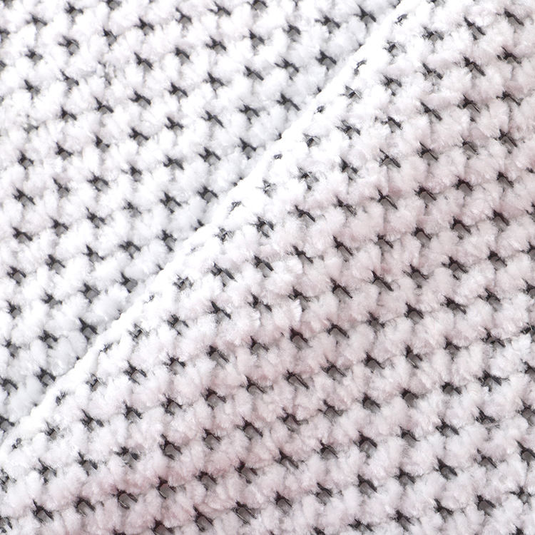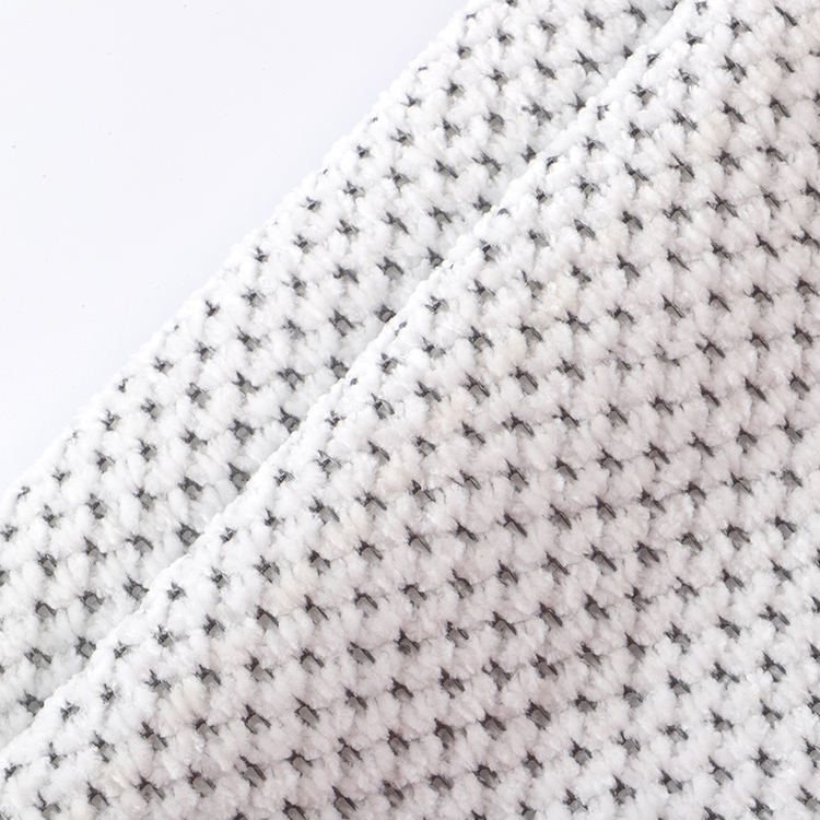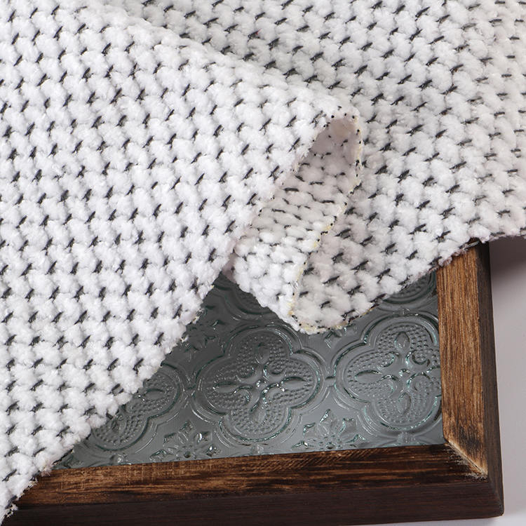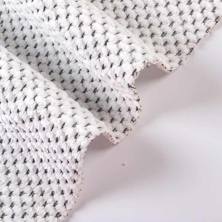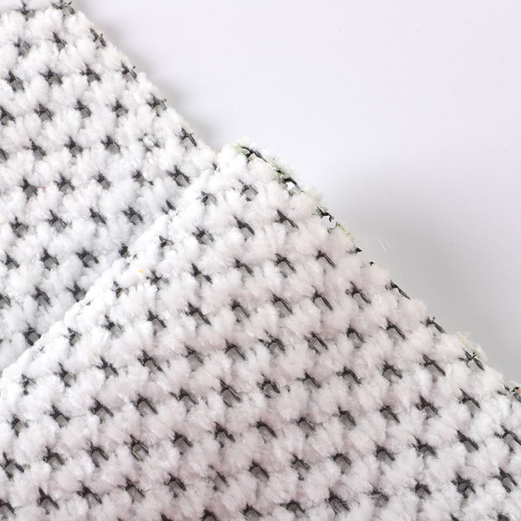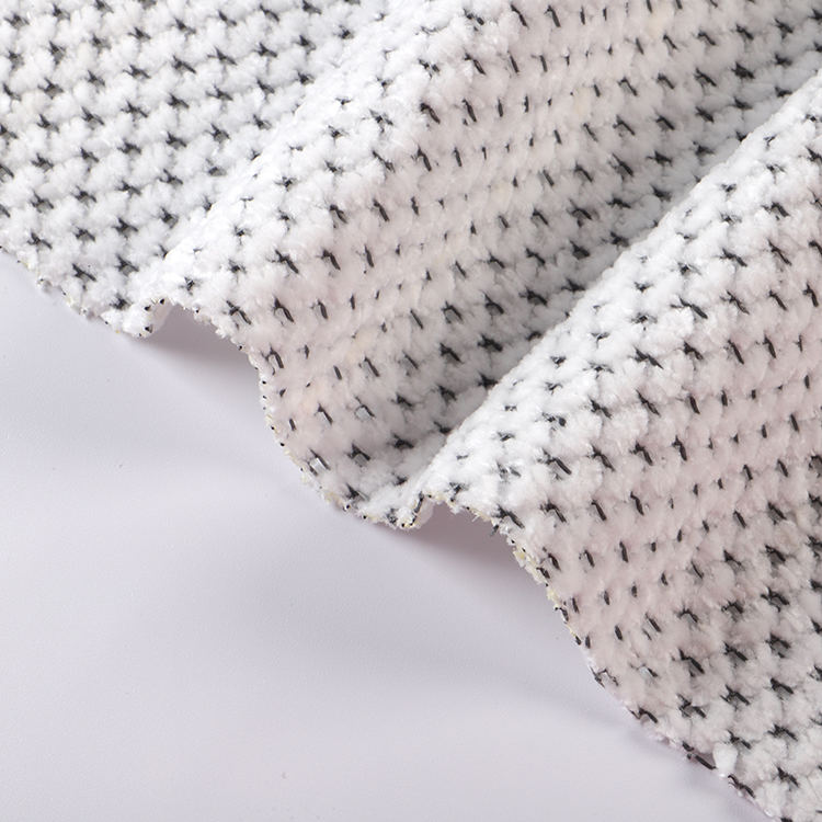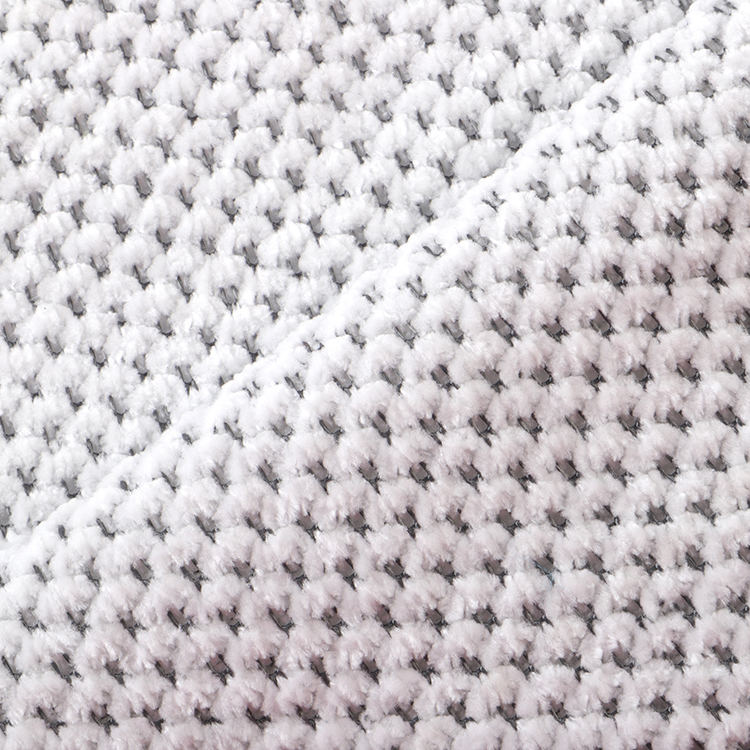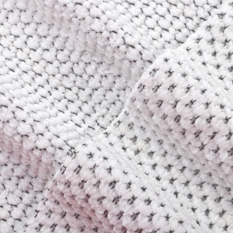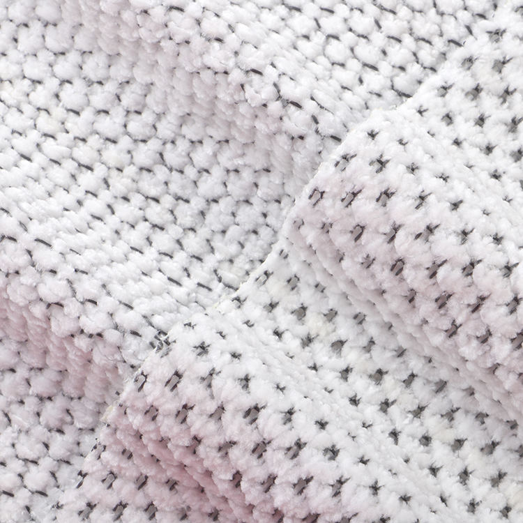 Ткань Chenille A# имеет низкую высоту кучи 1 мм, что способствует его гладкому и утонченному внешнему виду, когда его легко чистить и поддерживать. Вязаная техника, используемая в его производстве, повышает прочность и долговечность ткани, что делает ее идеальным выбором для ковров и ковров.